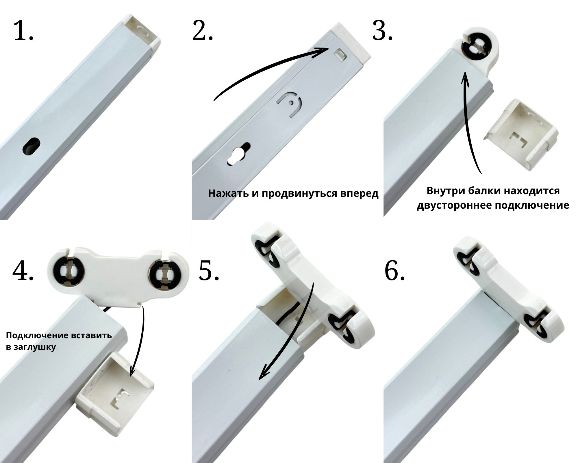 Светильник Т8 1200 мм с односторонним подключением предназначен для установки двух LED-ламп, металлический корпус, с пластиковыми держателями. В целях безопасности при транспортировке, пластиковые держатели ламп сняты и спрятаны в саму балку, их необходимо будет извлечь и вставить на место.